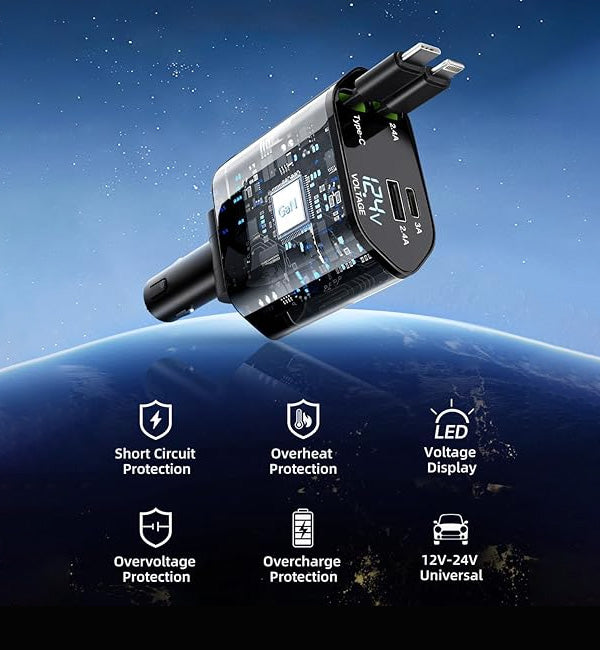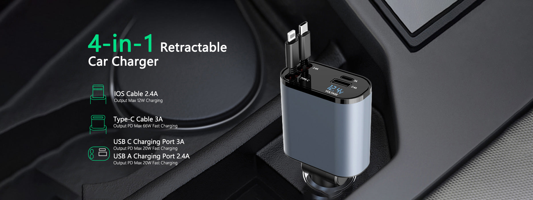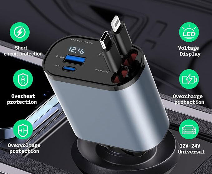 - Clutter-Free Convenience: Retractable cables keep your car organized and clean while offering easy access to power.